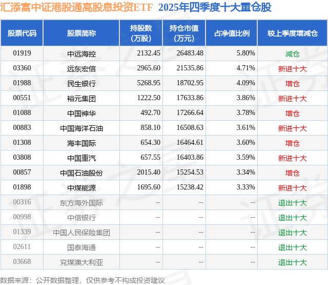从基金规模来看,汇添富中证港股通高股息投资ETF基金2025年四季度公布的基金规模为45.7亿元,较上一期规模31.57亿元变化了14.12亿元,环比变化了44.73%。该基金最新一期资产配置为:股票占净值比98.11%,无债券类资产,现金占净值比9.37%。从基金持仓来看,该基金当季前十大股票仓位达39.71%,第一大重仓股为中远海控(01919),持仓占比为5.8%。