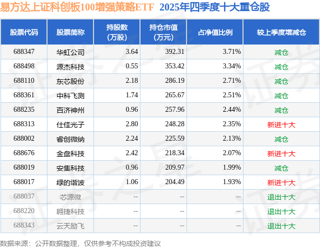 从基金规模来看,易方达上证科创板100增强策略ETF基金2025年四季度公布的基金规模为1.06亿元,较上一期规模1.33亿元变化了-2777.42万元,环比变化了-20.81%。该基金最新一期资产配置为:股票占净值比98.98%,债券占净值比0.09%,现金占净值比1.09%。从基金持仓来看,该基金当季前十大股票仓位达25.18%,第一大重仓股为华虹公司(688347),持仓占比为3.71%。