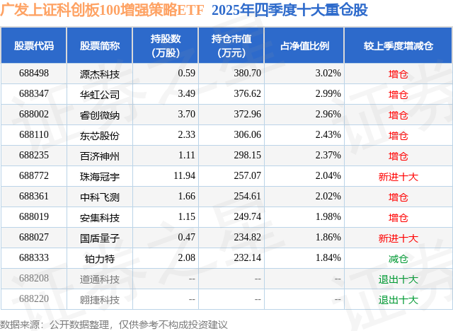 证券之星消息,日前广发上证科创板100增强策略ETF基金公布四季报,2025年四季度最新规模1.26亿元,季度净值涨幅为-0.75%。