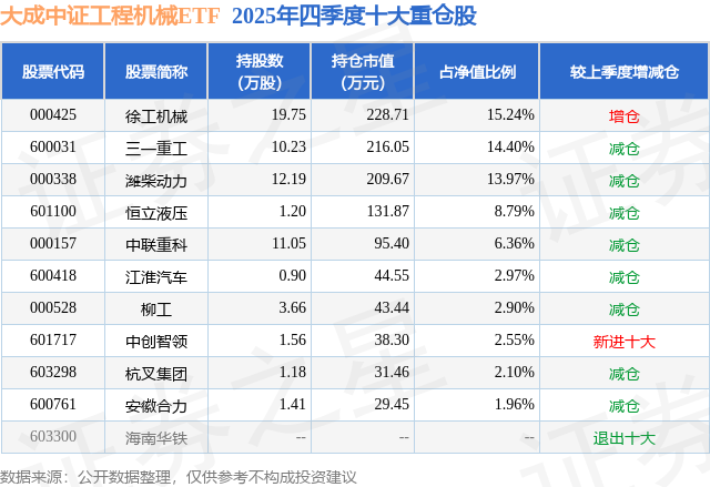 证券之星消息,日前大成中证工程机械ETF基金公布四季报,2025年四季度最新规模0.15亿元,季度净值涨幅为3.87%。