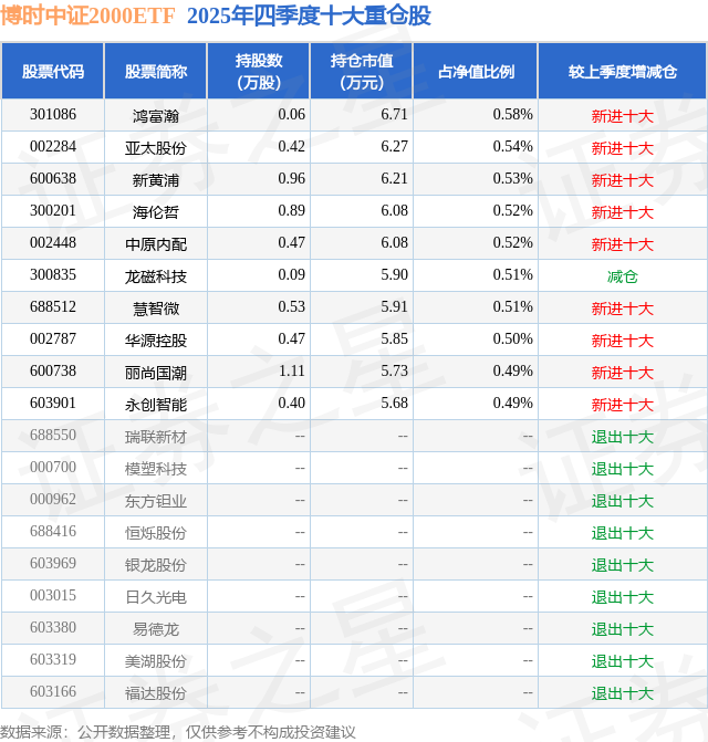 从基金规模来看,博时中证2000ETF基金2025年四季度公布的基金规模为0.12亿元,较上一期规模1278.16万元变化了-116.49万元,环比变化了-9.11%。该基金最新一期资产配置为:股票占净值比96.0%,无债券类资产,现金占净值比3.46%。从基金持仓来看,该基金当季前十大股票仓位达5.19%,第一大重仓股为鸿富瀚(301086),持仓占比为0.58%。