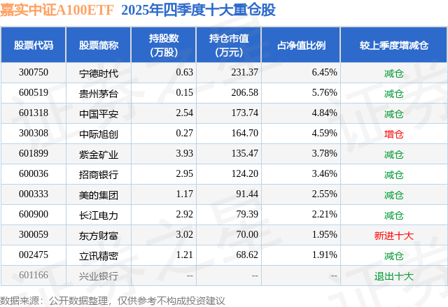 从基金规模来看,嘉实中证A100ETF基金2025年四季度公布的基金规模为0.36亿元,较上一期规模3793.58万元变化了-205.05万元,环比变化了-5.41%。该基金最新一期资产配置为:股票占净值比98.97%,无债券类资产,现金占净值比1.45%。从基金持仓来看,该基金当季前十大股票仓位达37.5%,第一大重仓股为宁德时代(300750),持仓占比为6.45%。