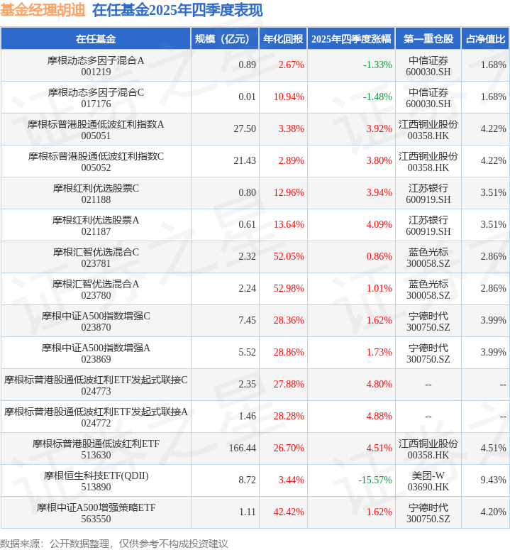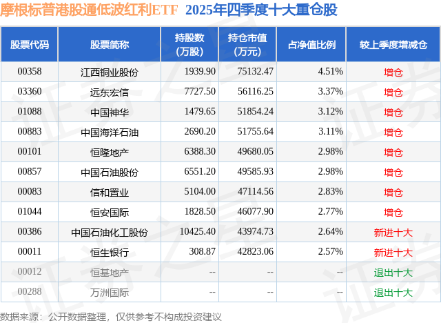 证券之星消息,日前摩根标普港股通低波红利ETF基金公布四季报,2025年四季度最新规模166.44亿元,季度净值涨幅为4.51%。