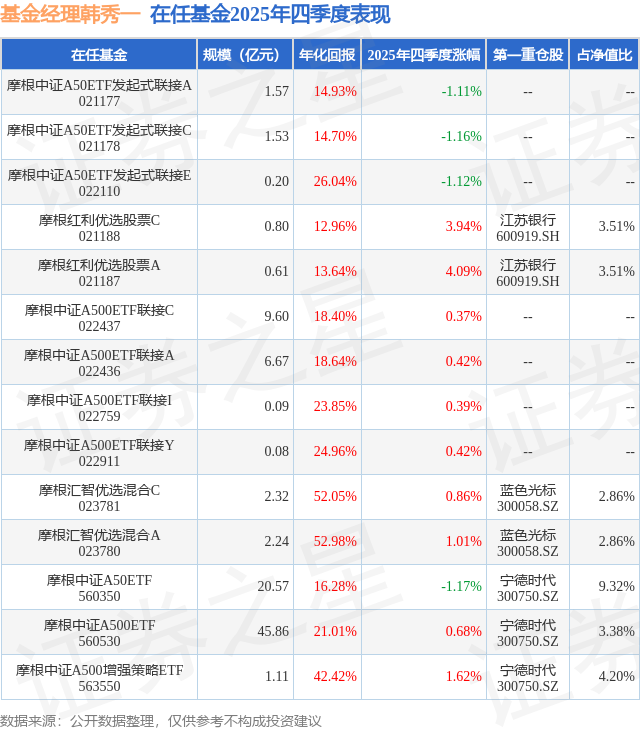 摩根中证A50ETF现任基金经理为韩秀一。其中在任基金经理韩秀一已从业2年又62天,2024年3月5日正式接手管理摩根中证A50ETF,任职期间累计回报为32.89%。目前还管理着14只基金产品(包括A类和C类),其中本季度表现最佳的基金为摩根红利优选股票A(021187),季度净值涨幅为4.09%。