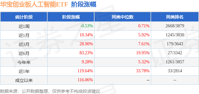 从业绩表现来看,华宝创业板人工智能ETF基金过去一年净值涨幅为119.64%,在同类基金中排名33/2814,同类基金过去一年净值涨幅中位数为33.78%。而基金过去一年的最大回撤为-31.52%,成立以来的最大回撤为-31.52%。