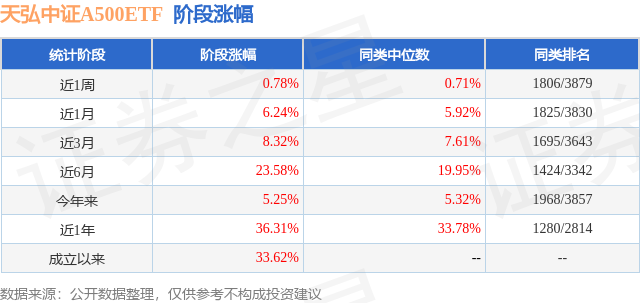 从业绩表现来看,天弘中证A500ETF基金过去一年净值涨幅为36.31%,在同类基金中排名1280/2814,同类基金过去一年净值涨幅中位数为33.78%。而基金过去一年的最大回撤为-11.87%,成立以来的最大回撤为-11.87%。