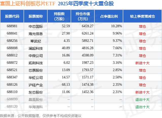 从基金规模来看,富国上证科创板芯片ETF基金2025年四季度公布的基金规模为6.29亿元,较上一期规模6.11亿元变化了1750.03万元,环比变化了2.86%。该基金最新一期资产配置为:股票占净值比99.76%,无债券类资产,现金占净值比0.44%。从基金持仓来看,该基金当季前十大股票仓位达57.75%,第一大重仓股为中芯国际(688981),持仓占比为10.28%。