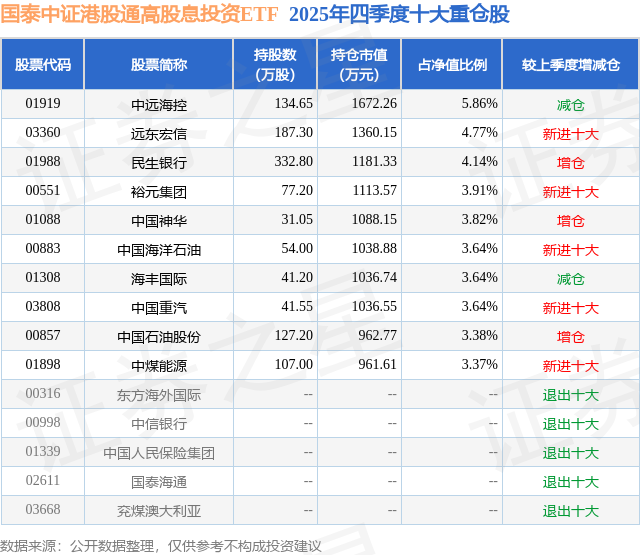 从基金规模来看,国泰中证港股通高股息投资ETF基金2025年四季度公布的基金规模为2.85亿元,较上一期规模2.2亿元变化了6504.35万元,环比变化了29.55%。该基金最新一期资产配置为:股票占净值比99.14%,无债券类资产,现金占净值比2.42%。从基金持仓来看,该基金当季前十大股票仓位达40.17%,第一大重仓股为中远海控(01919),持仓占比为5.86%。
