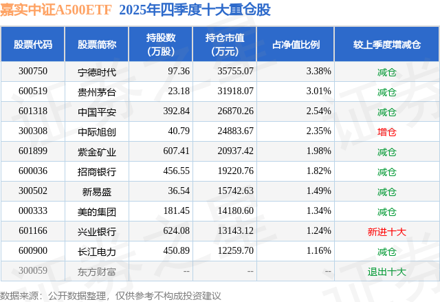 从基金规模来看,嘉实中证A500ETF基金2025年四季度公布的基金规模为105.89亿元,较上一期规模119.13亿元变化了-13.23亿元,环比变化了-11.11%。该基金最新一期资产配置为:股票占净值比99.89%,无债券类资产,现金占净值比0.45%。从基金持仓来看,该基金当季前十大股票仓位达20.31%,第一大重仓股为宁德时代(300750),持仓占比为3.38%。