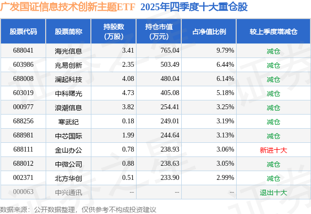 从基金规模来看,广发国证信息技术创新主题ETF基金2025年四季度公布的基金规模为0.78亿元,较上一期规模9979.47万元变化了-2162.14万元,环比变化了-21.67%。该基金最新一期资产配置为:股票占净值比99.39%,无债券类资产,现金占净值比0.66%。从基金持仓来看,该基金当季前十大股票仓位达46.22%,第一大重仓股为海光信息(688041),持仓占比为9.79%。