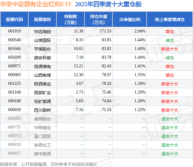 从基金规模来看,华安中证国有企业红利ETF基金2025年四季度公布的基金规模为0.58亿元,较上一期规模5284.61万元变化了544.85万元,环比变化了10.31%。该基金最新一期资产配置为:股票占净值比96.95%,无债券类资产,现金占净值比3.26%。从基金持仓来看,该基金当季前十大股票仓位达15.15%,第一大重仓股为中远海控(601919),持仓占比为2.94%。
