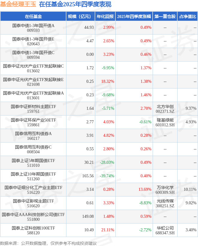 国泰上证科创板100ETF现任基金经理为王玉,近期离任的基金经理为刘昉元。其中在任基金经理王玉已从业6年又31天,2023年9月6日正式接手管理国泰上证科创板100ETF,任职期间累计回报为57.76%。目前还管理着16只基金产品(包括A类和C类),其中本季度表现最佳的基金为国泰中证细分化工产业主题ETF(516220),季度净值涨幅为13.69%。