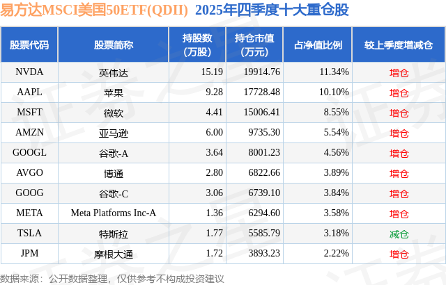 从基金规模来看,易方达MSCI美国50ETF(QDII)基金2025年四季度公布的基金规模为17.56亿元,较上一期规模15.79亿元变化了1.77亿元,环比变化了11.21%。该基金最新一期资产配置为:股票占净值比90.41%,无债券类资产,现金占净值比6.27%。从基金持仓来看,该基金当季前十大股票仓位达56.8%,第一大重仓股为英伟达(NVDA),持仓占比为11.34%。