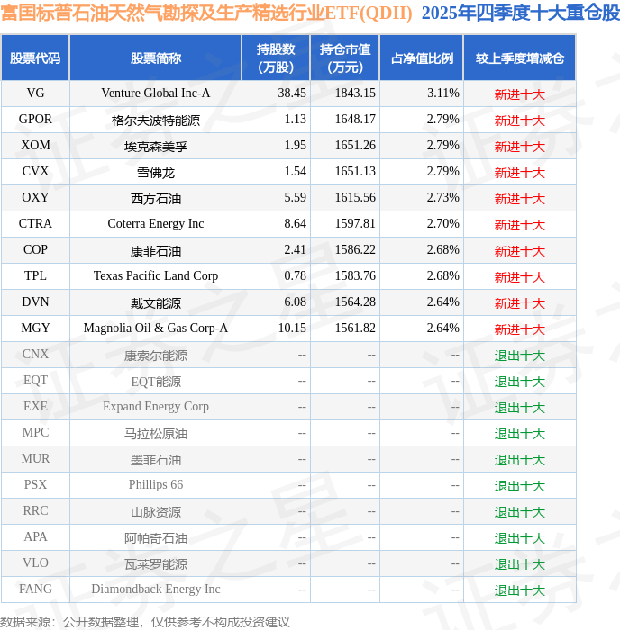从基金规模来看,富国标普石油天然气勘探及生产精选行业ETF(QDII)基金2025年四季度公布的基金规模为5.92亿元,较上一期规模6.13亿元变化了-2166.9万元,环比变化了-3.53%。该基金最新一期资产配置为:股票占净值比99.8%,无债券类资产,现金占净值比0.19%。从基金持仓来看,该基金当季前十大股票仓位达27.55%,第一大重仓股为Venture Global Inc-A(VG),持仓占比为3.11%。