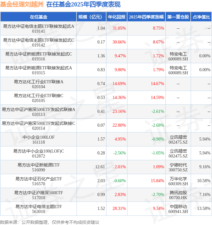 易方达中证电信主题ETF现任基金经理为刘越洲,本季度增聘基金经理刘越洲,近期离任的基金经理为鲍杰。其中在任基金经理刘越洲已从业0年又72天,2025年11月12日正式接手管理易方达中证电信主题ETF,任职期间累计回报为12.68%。目前还管理着14只基金产品(包括A类和C类),其中本季度表现最佳的基金为易方达中证石化产业ETF(516570),季度净值涨幅为15.84%。