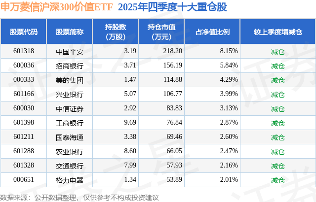 从基金规模来看,申万菱信沪深300价值ETF基金2025年四季度公布的基金规模为0.27亿元,较上一期规模3242.0万元变化了-565.63万元,环比变化了-17.45%。该基金最新一期资产配置为:股票占净值比98.39%,无债券类资产,现金占净值比1.9%。从基金持仓来看,该基金当季前十大股票仓位达37.51%,第一大重仓股为中国平安(601318),持仓占比为8.15%。