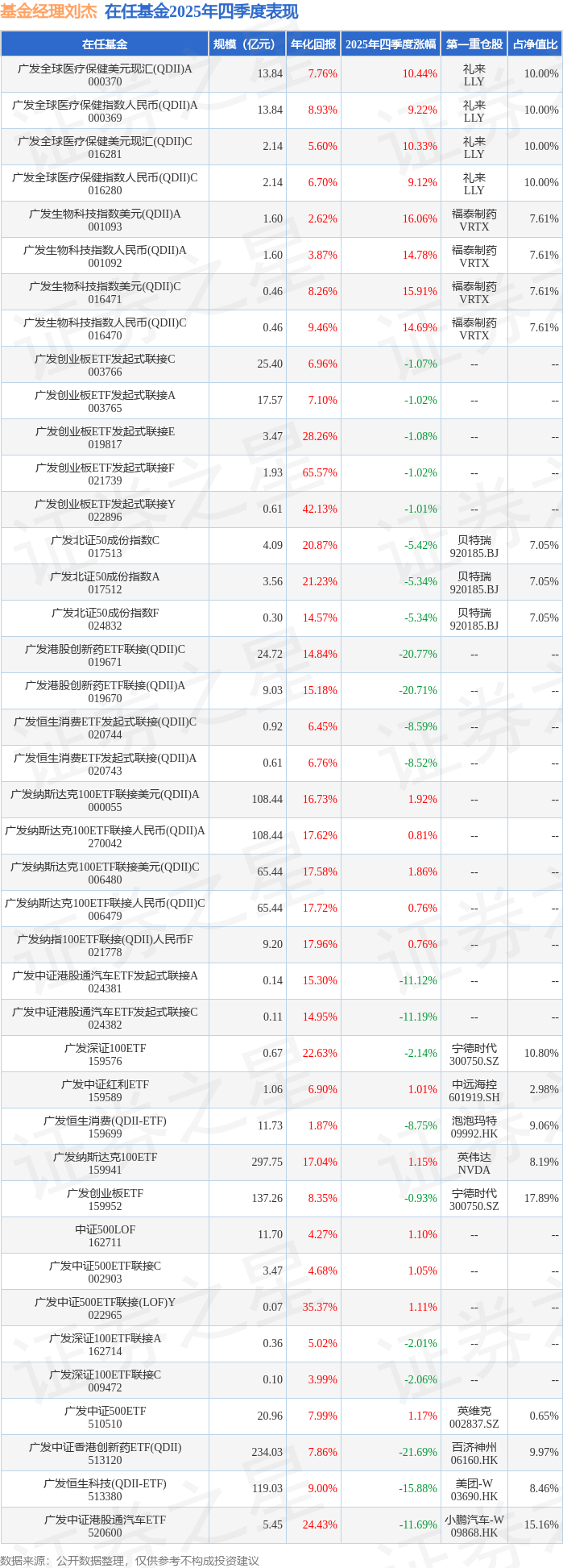 从基金规模来看,广发恒生消费(QDII-ETF)基金2025年四季度公布的基金规模为11.73亿元,较上一期规模11.35亿元变化了3864.44万元,环比变化了3.41%。该基金最新一期资产配置为:股票占净值比98.79%,无债券类资产,现金占净值比1.32%。从基金持仓来看,该基金当季前十大股票仓位达58.06%,第一大重仓股为泡泡玛特(09992),持仓占比为9.06%。