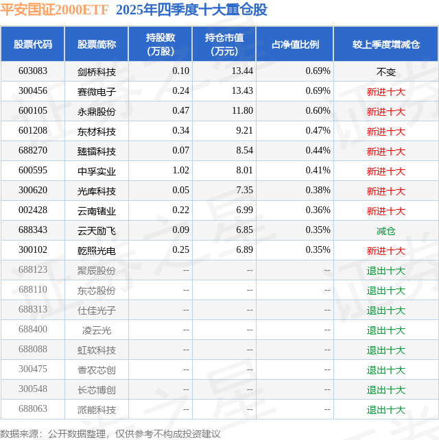 从基金规模来看,平安国证2000ETF基金2025年四季度公布的基金规模为0.19亿元,较上一期规模2270.24万元变化了-320.26万元,环比变化了-14.11%。该基金最新一期资产配置为:股票占净值比96.53%,无债券类资产,现金占净值比2.83%。从基金持仓来看,该基金当季前十大股票仓位达4.74%,第一大重仓股为剑桥科技(603083),持仓占比为0.69%。