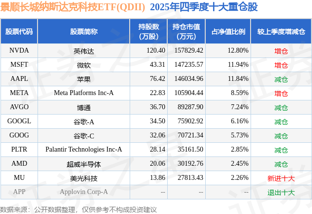 从基金规模来看,景顺长城纳斯达克科技ETF(QDII)基金2025年四季度公布的基金规模为123.32亿元,较上一期规模118.35亿元变化了4.97亿元,环比变化了4.2%。该基金最新一期资产配置为:股票占净值比94.75%,债券占净值比2.79%,现金占净值比1.26%。从基金持仓来看,该基金当季前十大股票仓位达71.86%,第一大重仓股为英伟达(NVDA),持仓占比为12.8%。