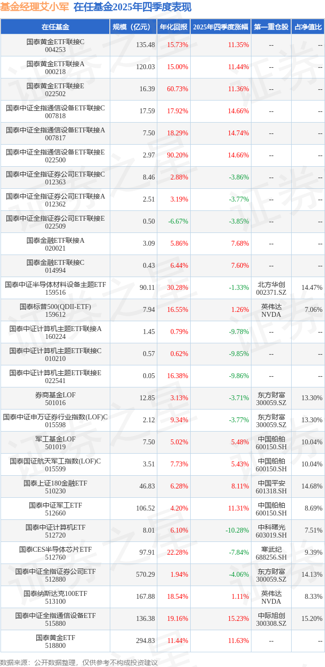 国泰中证半导体材料设备主题ETF现任基金经理为艾小军。其中在任基金经理艾小军已从业12年又13天,2023年7月19日正式接手管理国泰中证半导体材料设备主题ETF,任职期间累计回报为89.67%。目前还管理着28只基金产品(包括A类和C类),其中本季度表现最佳的基金为国泰中证全指通信设备ETF(515880),季度净值涨幅为15.23%。