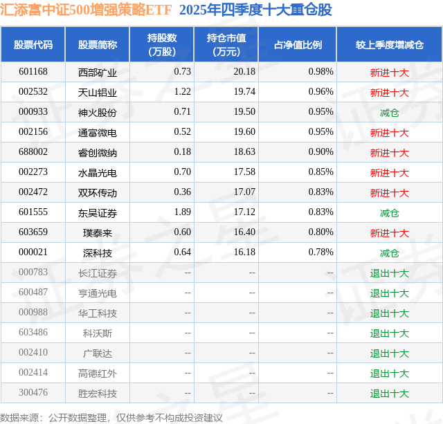 从基金规模来看,汇添富中证500增强策略ETF基金2025年四季度公布的基金规模为0.21亿元,较上一期规模2014.53万元变化了48.08万元,环比变化了2.39%。该基金最新一期资产配置为:股票占净值比97.61%,债券占净值比0.03%,现金占净值比2.77%。从基金持仓来看,该基金当季前十大股票仓位达8.83%,第一大重仓股为西部矿业(601168),持仓占比为0.98%。