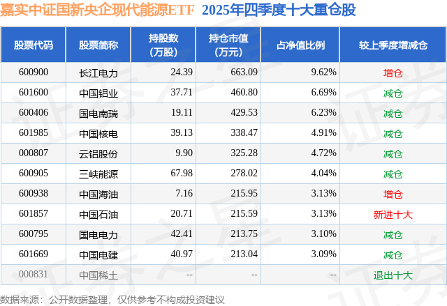 从基金规模来看,嘉实中证国新央企现代能源ETF基金2025年四季度公布的基金规模为0.69亿元,较上一期规模6170.87万元变化了718.86万元,环比变化了11.65%。该基金最新一期资产配置为:股票占净值比99.42%,无债券类资产,现金占净值比0.88%。从基金持仓来看,该基金当季前十大股票仓位达48.66%,第一大重仓股为长江电力(600900),持仓占比为9.62%。