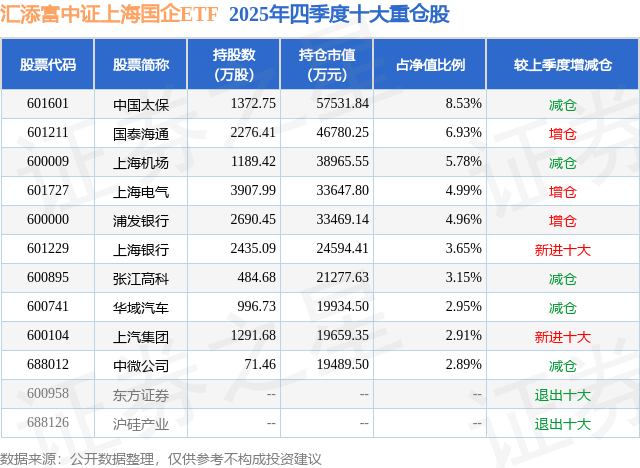 证券之星消息,日前汇添富中证上海国企ETF基金公布四季报,2025年四季度最新规模67.47亿元,季度净值涨幅为-2.09%。