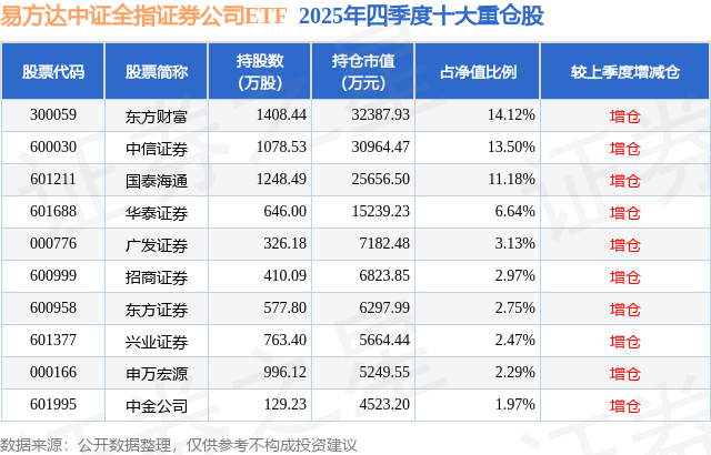 从基金规模来看,易方达中证全指证券公司ETF基金2025年四季度公布的基金规模为22.94亿元,较上一期规模18.75亿元变化了4.19亿元,环比变化了22.34%。该基金最新一期资产配置为:股票占净值比99.82%,无债券类资产,现金占净值比0.35%。从基金持仓来看,该基金当季前十大股票仓位达61.02%,第一大重仓股为东方财富(300059),持仓占比为14.12%。