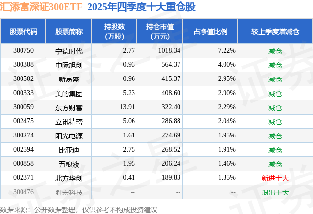 从基金规模来看,汇添富深证300ETF基金2025年四季度公布的基金规模为1.41亿元,较上一期规模1.52亿元变化了-1057.84万元,环比变化了-6.98%。该基金最新一期资产配置为:股票占净值比99.52%,无债券类资产,现金占净值比0.64%。从基金持仓来看,该基金当季前十大股票仓位达28.07%,第一大重仓股为宁德时代(300750),持仓占比为7.22%。