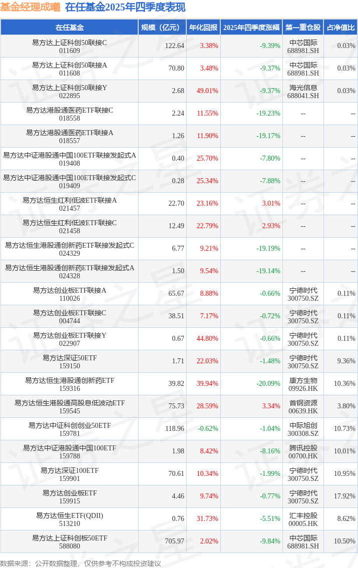 证券之星消息,日前易方达创业板ETF基金公布四季报,2025年四季度最新规模4.46亿元,季度净值涨幅为-0.77%。