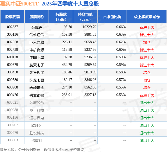 证券之星消息,日前嘉实中证500ETF基金公布四季报,2025年四季度最新规模156.15亿元,季度净值涨幅为1.12%。