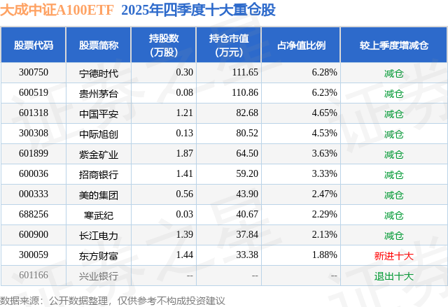 从基金规模来看,大成中证A100ETF基金2025年四季度公布的基金规模为0.18亿元,较上一期规模2639.39万元变化了-860.53万元,环比变化了-32.6%。该基金最新一期资产配置为:股票占净值比98.02%,无债券类资产,现金占净值比2.01%。从基金持仓来看,该基金当季前十大股票仓位达37.42%,第一大重仓股为宁德时代(300750),持仓占比为6.28%。