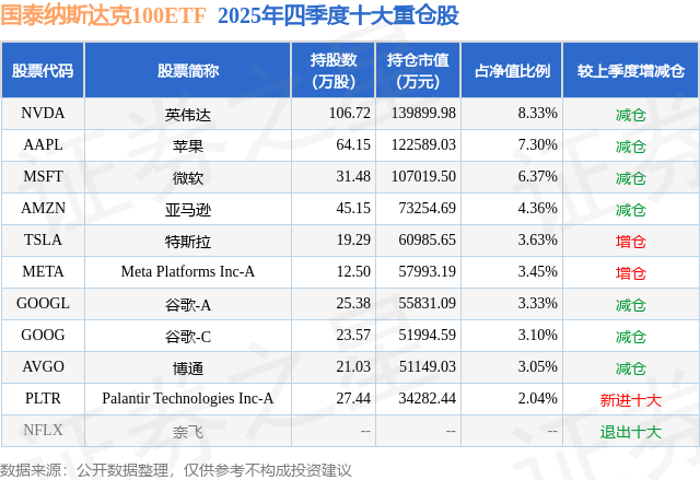 证券之星消息,日前国泰纳斯达克100ETF基金公布四季报,2025年四季度最新规模167.88亿元,季度净值涨幅为1.11%。