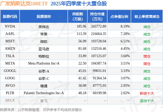 从基金规模来看,广发纳斯达克100ETF基金2025年四季度公布的基金规模为297.75亿元,较上一期规模290.2亿元变化了7.55亿元,环比变化了2.6%。该基金最新一期资产配置为:股票占净值比89.6%,无债券类资产,现金占净值比7.98%。从基金持仓来看,该基金当季前十大股票仓位达44.91%,第一大重仓股为英伟达(NVDA),持仓占比为8.19%。