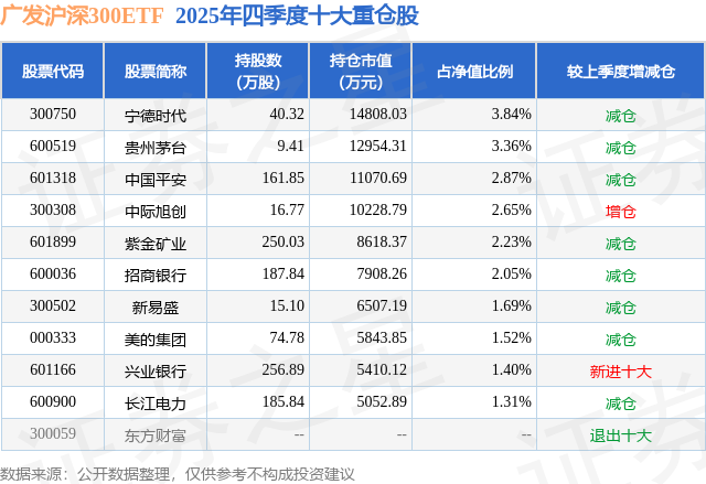 从基金规模来看,广发沪深300ETF基金2025年四季度公布的基金规模为38.56亿元,较上一期规模44.68亿元变化了-6.11亿元,环比变化了-13.69%。该基金最新一期资产配置为:股票占净值比99.42%,无债券类资产,现金占净值比0.64%。从基金持仓来看,该基金当季前十大股票仓位达22.92%,第一大重仓股为宁德时代(300750),持仓占比为3.84%。