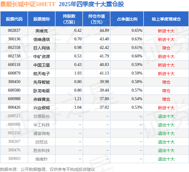 证券之星消息,日前景顺长城中证500ETF基金公布四季报,2025年四季度最新规模0.69亿元,季度净值涨幅为0.81%。