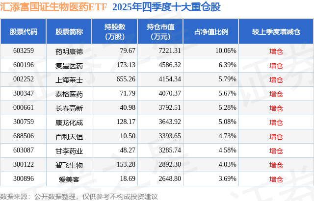 从基金规模来看,汇添富国证生物医药ETF基金2025年四季度公布的基金规模为7.18亿元,较上一期规模5.81亿元变化了1.36亿元,环比变化了23.44%。该基金最新一期资产配置为:股票占净值比99.31%,无债券类资产,现金占净值比0.93%。从基金持仓来看,该基金当季前十大股票仓位达55.3%,第一大重仓股为药明康德(603259),持仓占比为10.06%。