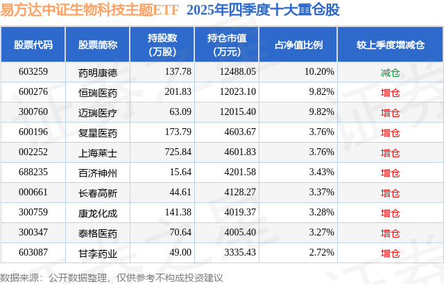 从基金规模来看,易方达中证生物科技主题ETF基金2025年四季度公布的基金规模为12.24亿元,较上一期规模12.99亿元变化了-7517.0万元,环比变化了-5.79%。该基金最新一期资产配置为:股票占净值比99.68%,无债券类资产,现金占净值比0.49%。从基金持仓来看,该基金当季前十大股票仓位达53.43%,第一大重仓股为药明康德(603259),持仓占比为10.2%。