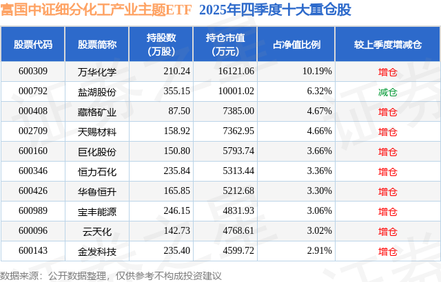 从基金规模来看,富国中证细分化工产业主题ETF基金2025年四季度公布的基金规模为15.81亿元,较上一期规模12.64亿元变化了3.18亿元,环比变化了25.14%。该基金最新一期资产配置为:股票占净值比99.76%,无债券类资产,现金占净值比0.52%。从基金持仓来看,该基金当季前十大股票仓位达45.15%,第一大重仓股为万华化学(600309),持仓占比为10.19%。
