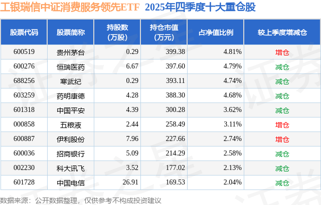 从基金规模来看,工银瑞信中证消费服务领先ETF基金2025年四季度公布的基金规模为0.83亿元,较上一期规模8939.8万元变化了-638.47万元,环比变化了-7.14%。该基金最新一期资产配置为:股票占净值比99.18%,无债券类资产,现金占净值比0.99%。从基金持仓来看,该基金当季前十大股票仓位达35.24%,第一大重仓股为贵州茅台(600519),持仓占比为4.81%。