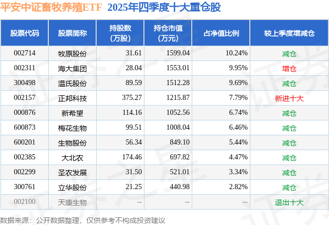 从基金规模来看,平安中证畜牧养殖ETF基金2025年四季度公布的基金规模为1.56亿元,较上一期规模1.79亿元变化了-2268.37万元,环比变化了-12.69%。该基金最新一期资产配置为:股票占净值比99.02%,无债券类资产,现金占净值比1.22%。从基金持仓来看,该基金当季前十大股票仓位达66.94%,第一大重仓股为牧原股份(002714),持仓占比为10.24%。