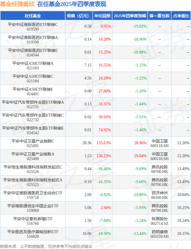 平安中证畜牧养殖ETF现任基金经理为翁欣。其中在任基金经理翁欣已从业2年又40天,2023年12月27日正式接手管理平安中证畜牧养殖ETF,任职期间累计回报为-1.18%。目前还管理着17只基金产品(包括A类和C类),其中本季度表现最佳的基金为平安中证卫星产业指数A(025490),季度净值涨幅为29.04%。