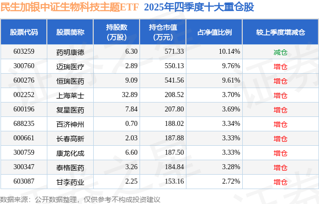 从基金规模来看,民生加银中证生物科技主题ETF基金2025年四季度公布的基金规模为0.56亿元,较上一期规模5902.29万元变化了-267.41万元,环比变化了-4.53%。该基金最新一期资产配置为:股票占净值比98.21%,无债券类资产,现金占净值比1.76%。从基金持仓来看,该基金当季前十大股票仓位达52.9%,第一大重仓股为药明康德(603259),持仓占比为10.14%。