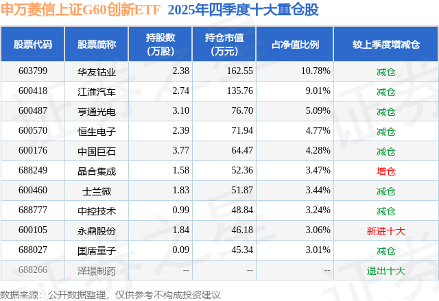 从基金规模来看,申万菱信上证G60创新ETF基金2025年四季度公布的基金规模为0.15亿元,较上一期规模1661.64万元变化了-154.01万元,环比变化了-9.27%。该基金最新一期资产配置为:股票占净值比97.94%,无债券类资产,现金占净值比2.22%。从基金持仓来看,该基金当季前十大股票仓位达50.15%,第一大重仓股为华友钴业(603799),持仓占比为10.78%。