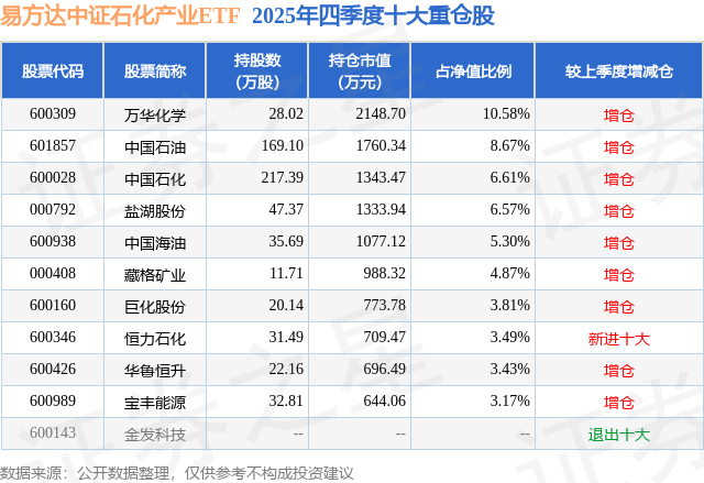 从基金规模来看,易方达中证石化产业ETF基金2025年四季度公布的基金规模为2.03亿元,较上一期规模8181.02万元变化了1.21亿元,环比变化了148.25%。该基金最新一期资产配置为:股票占净值比99.59%,无债券类资产,现金占净值比0.51%。从基金持仓来看,该基金当季前十大股票仓位达56.5%,第一大重仓股为万华化学(600309),持仓占比为10.58%。