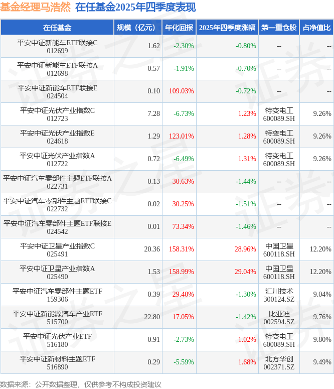 平安中证新能源汽车产业ETF现任基金经理为马浩然,本季度增聘基金经理马浩然。其中在任基金经理马浩然已从业0年又95天,2025年10月20日正式接手管理平安中证新能源汽车产业ETF,任职期间累计回报为11.57%。目前还管理着15只基金产品(包括A类和C类),其中本季度表现最佳的基金为平安中证卫星产业指数A(025490),季度净值涨幅为29.04%。