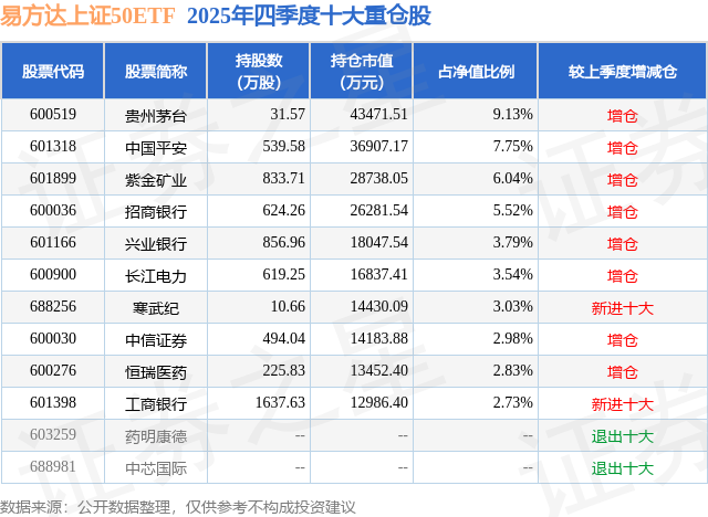 从基金规模来看,易方达上证50ETF基金2025年四季度公布的基金规模为47.6亿元,较上一期规模44.96亿元变化了2.64亿元,环比变化了5.88%。该基金最新一期资产配置为:股票占净值比99.21%,无债券类资产,现金占净值比0.76%。从基金持仓来看,该基金当季前十大股票仓位达47.34%,第一大重仓股为贵州茅台(600519),持仓占比为9.13%。