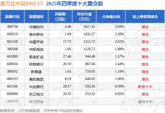 从基金规模来看,易方达中证800ETF基金2025年四季度公布的基金规模为6.02亿元,较上一期规模3.34亿元变化了2.68亿元,环比变化了80.32%。该基金最新一期资产配置为:股票占净值比96.21%,无债券类资产,现金占净值比3.46%。从基金持仓来看,该基金当季前十大股票仓位达16.13%,第一大重仓股为宁德时代(300750),持仓占比为2.69%。