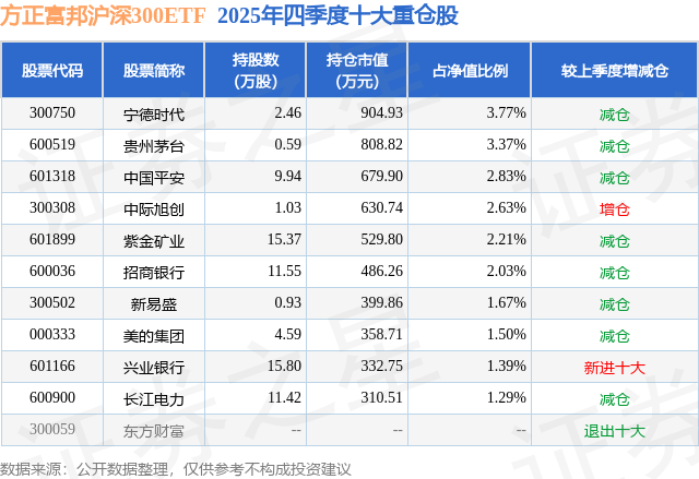 从基金规模来看,方正富邦沪深300ETF基金2025年四季度公布的基金规模为2.4亿元,较上一期规模2.37亿元变化了283.93万元,环比变化了1.2%。该基金最新一期资产配置为:股票占净值比98.85%,无债券类资产,现金占净值比1.23%。从基金持仓来看,该基金当季前十大股票仓位达22.69%,第一大重仓股为宁德时代(300750),持仓占比为3.77%。