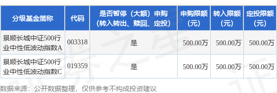 证券之星消息,1月26日景顺长城基金管理有限公司发布《关于景顺长城中证500行业中性低波动指数型证券投资基金暂停接受伍佰万元以上申购(含日常申购和定期定额申购)及转换转入业务的公告》。公告中提示,为保护基金份额持有人利益,保障基金平稳运作,自2026年1月26日起景顺长城中证500行业中性低波动指数型证券投资基金暂停接受伍佰万元以上申购(含日常申购和定期定额申购)及转换转入业务,申购、转换转入上限金额为500.0万元,下属分级基金调整明细如下: